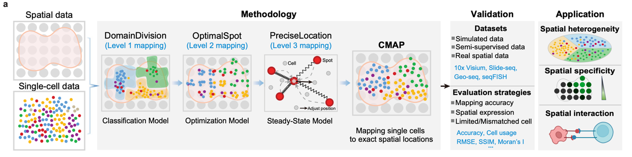 針對這一問題,研究團隊提出了CMAP(Cellular Mapping of Attributes with Position)計算模型,通過整合單細胞和空間轉錄組數據,采用“分治”策略,實現大規模單細胞向空間位置的高精度映射。
