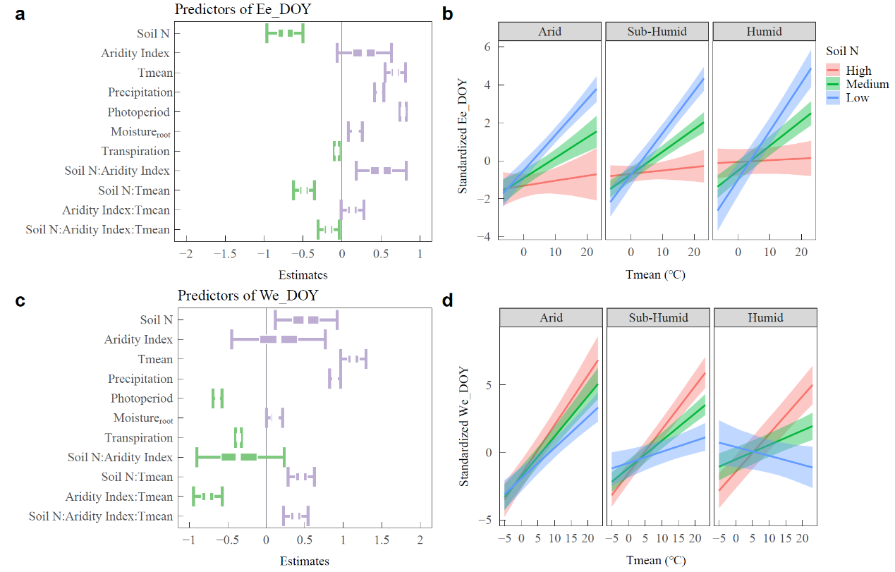 該研究整合了一個覆蓋北半球(23°~66°N)的通過微樹芯(Microcoring)技術監(jiān)測的75個研究樣地、20個針葉樹種的木質部物候數(shù)據(jù)集,定量分析了局地環(huán)境因子(如土壤氮含量、濕度等)的變化對秋季物候響應溫度的影響。研究表明,升高的土壤氮含量延遲了木質部細胞壁加厚這一過程,但提前了木質部細胞增大這一過程,而且是在越濕潤的地方越提前,這對上述理論和控制實驗結論提出了挑戰(zhàn)。