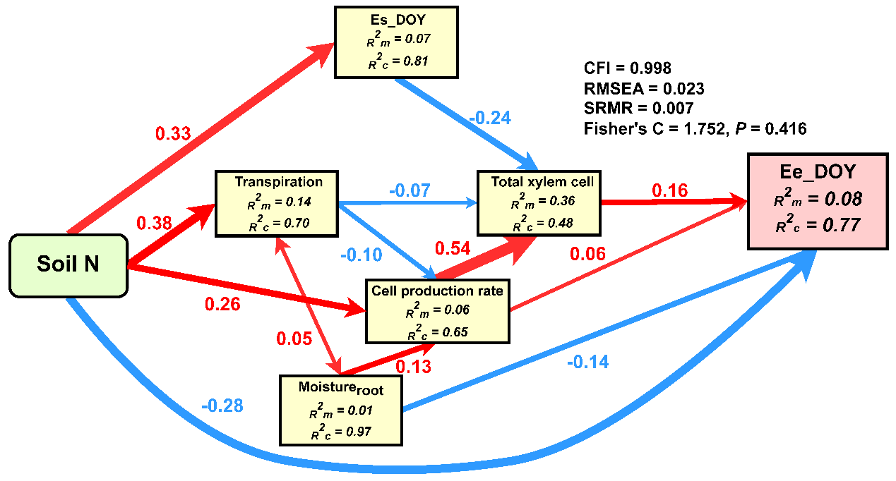 細胞增大需要大量的水分來維持膨壓,而細胞壁加厚則主要依賴于光合產(chǎn)物來維持。因此,木質部細胞增大和細胞壁加厚對于土壤氮含量的這一解耦響應說明在北半球尺度上木質部生長的水分限制超過了能量限制,但為什么是在越濕潤的地方水分限制越大呢?初步分析發(fā)現(xiàn),在土壤氮含量和濕度越高的情況下,樹木的蒸發(fā)越高,意味著樹木的水分消耗越高。與控制實驗不同,自然環(huán)境下即使?jié)駶櫟纳忠矔邢鄬θ彼募竟?jié),通常多發(fā)于夏秋季節(jié),所以樹木為了緩解可能發(fā)生的水分脅迫從而會提前結束木質部細胞增大這一高耗水過程。而且在越濕潤的地方土壤氮對樹木生長的促進作用越強,也就越容易導致耗水量增加。這也能解釋為什么在越濕潤的地方可能的水分限制導致的細胞增大提前程度越高。但科研人員通過結構方程模型分析發(fā)現(xiàn)最重要的機制目前的數(shù)據(jù)還不能完全解釋。