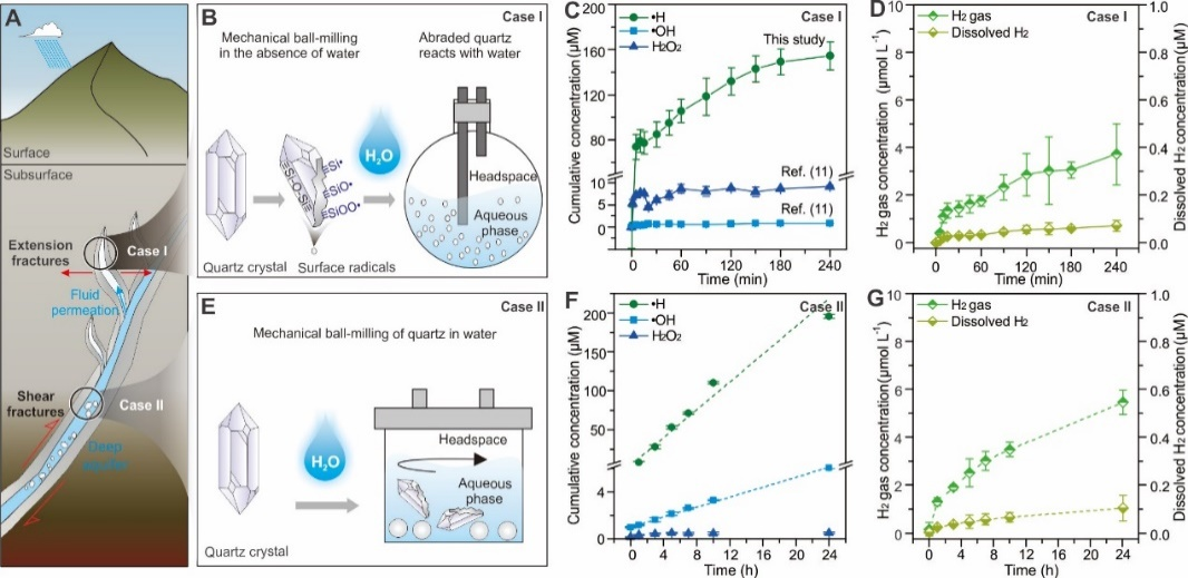 近日,中國科學(xué)院廣州地球化學(xué)研究所何宏平研究員、朱建喜研究員團隊的吳逍博士等人與林莽研究員、加拿大阿爾伯塔大學(xué)Kurt O. Konhauser教授、多倫多大學(xué)Barbara Sherwood Lollar教授開展合作研究,圍繞“深部地下的宜居性形成與演變”這一關(guān)鍵科學(xué)問題,從礦物表/界面反應(yīng)的新視角出發(fā),模擬斷裂活動導(dǎo)致硅酸鹽礦物中硅氧鍵(≡Si-O-Si≡)破裂產(chǎn)生自由基化學(xué)位點(≡SiO?和≡Si?)并分解水的過程(圖1),研究發(fā)現(xiàn)斷裂在地下巖石傳播過程中同時產(chǎn)生拉伸斷裂(Case I)和剪切斷裂(Case II),二者誘發(fā)的礦物-水界面反應(yīng)均可產(chǎn)生少量活性氧(ROS)和高濃度H2,但拉伸斷裂更容易積累過氧化氫(H2O2),由此形成新的氧化還原電對(H2O2/H2)(圖1),并在斷裂系統(tǒng)中構(gòu)建顯著的氧化還原梯度(–0.41 V ~ +0.82 V),足以氧化或還原Fe等大多數(shù)物質(zhì)。
