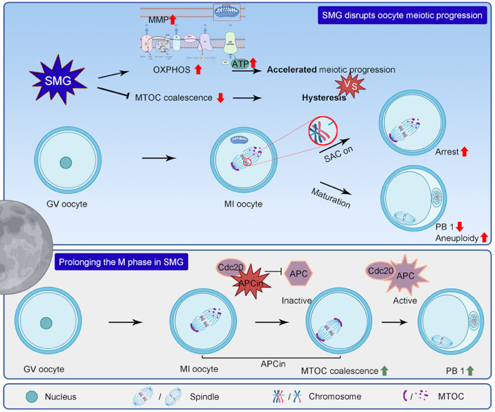 該研究顯示SMG誘導小鼠卵母細胞獨特的能量代謝損傷,表現為增加的氧化磷酸化(OXPHOS)與線粒體膜電位超極化,這不同于卵母細胞在常規重力下其他暴露所引起的能量代謝損傷,表明微重力與卵母細胞兩者的特殊性。與此同時,SMG加速減數分裂進程,但延遲了微管組裝中心(MTOC)融合,最終引起卵母細胞成熟阻滯。該研究針對加速的減數分裂進程,使用了后期促進復合體抑制劑(APCin)進行分裂期延長。結果表明延長分裂期改善了紡錘體組裝與MTOC融合,最終恢復SMG下卵母細胞第一極體(PB1)排放情況。該研究為微重力下卵母細胞成熟與空間雌性生殖提供了理論依據,并為未來開發空間生殖干預提供了潛在方案。
