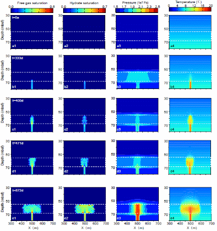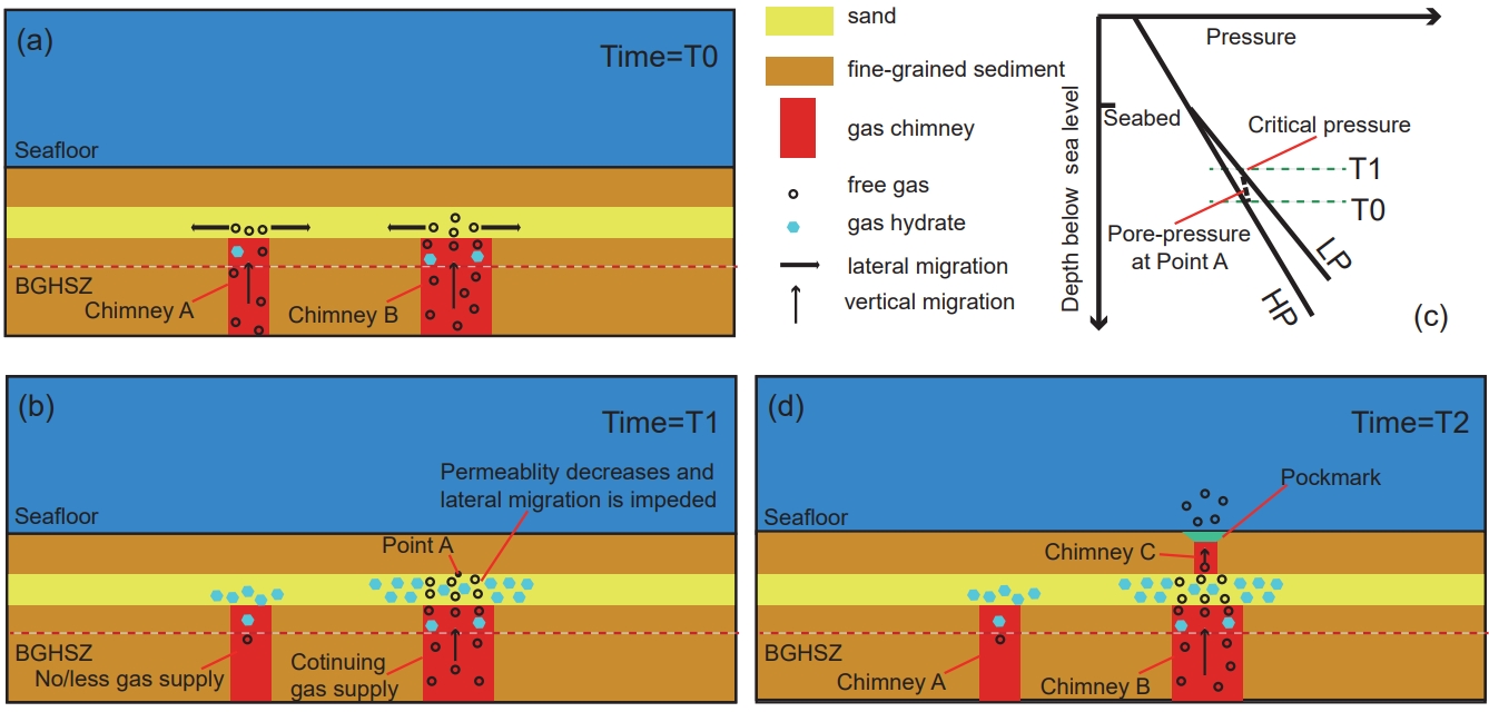 該研究還表明上覆泥層中二次水力壓裂的發(fā)生,須具備特定的超壓與氣體供給條件(圖3)。當(dāng)較低的甲烷通量在進(jìn)入砂層后迅速形成天然氣水合物,導(dǎo)致孔隙堵塞、滲透率降低,從而引發(fā)自封閉效應(yīng)。該過程抑制了氣體向上部的輸運(yùn),致使砂層頂界孔隙壓力無法有效累積至破裂壓力臨界值。這一機(jī)制很好地解釋了實際地質(zhì)現(xiàn)象:盡管部分砂層下伏氣煙囪結(jié)構(gòu)發(fā)育,但其對應(yīng)上覆地層中并未形成貫穿至海底的氣體逸出路徑。原因在于低通量條件下氣體運(yùn)移路徑被天然氣水合物阻斷,超壓體系未能充分發(fā)育,達(dá)不到泥巖破裂所需的最小壓力條件。