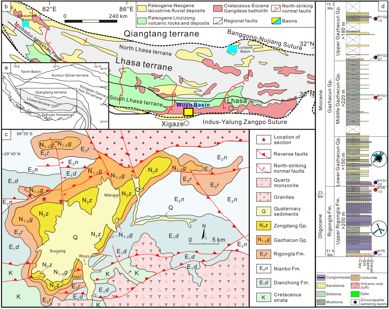 ?針對(duì)這一問(wèn)題,中國(guó)科學(xué)院廣州地球化學(xué)研究所博士后薛爾堃等聯(lián)合愛(ài)爾蘭都柏林圣三一大學(xué)David Chew教授,聚焦岡底斯地區(qū)的烏郁盆地(圖1),對(duì)盆地內(nèi)漸新世?中新世地層(約31-15 Ma)進(jìn)行系統(tǒng)的碎屑鋯石?磷灰石沉積物源分析,通過(guò)古水系重建揭示了南拉薩地塊漸新世-中新世時(shí)期的地形變化,為岡底斯弧的隆升過(guò)程提供了新的限定。