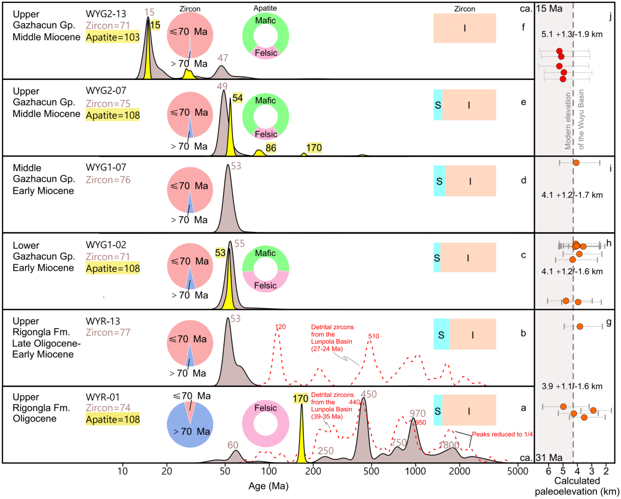 圖2 烏郁盆地漸新世-中新世地層碎屑鋯石和磷灰石年齡和源巖特征,以及前人古高程數(shù)據(jù)