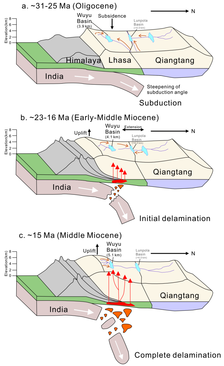 ?漸新世時(shí)期(不晚于31 Ma),由于拉薩地殼下印度巖石圈俯沖角度變陡而產(chǎn)生拖拽,導(dǎo)致岡底斯弧發(fā)生沉降,使其地勢(shì)較低,得以接受外部的碎屑物質(zhì)。之后由于印度巖石圈開(kāi)始拆沉,拖拽的力量減弱,岡底斯開(kāi)始逐漸隆升。15 Ma因印度巖石圈完全拆沉,導(dǎo)致軟流圈上涌和加速隆升。