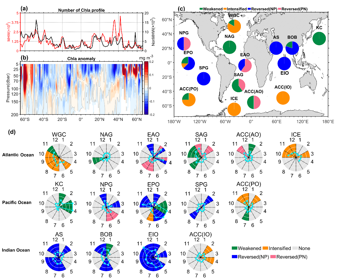 a:海洋熱浪(MHW)期間(紅線)與非 MHW 期間(黑線)葉綠素 a 剖面數(shù)量的緯向分布。b:全球海洋中葉綠素 a 濃度異常的緯向分布。c:基于 BGC-Argo 觀測(cè),15 個(gè)區(qū)域內(nèi)海洋熱浪期間不同類型垂直葉綠素 a 異常的比例分布。綠色表示減弱型(Weakened)、黃色表示增強(qiáng)型(Intensified)藍(lán)色和粉色分別表示兩類次表層反轉(zhuǎn)型(NP 和 PN)。d:海洋熱浪期間各月主導(dǎo)的垂直葉綠素 a 異常類型(填色),以及各類型在當(dāng)月 MHW 剖面中的占比(青色線條)。
