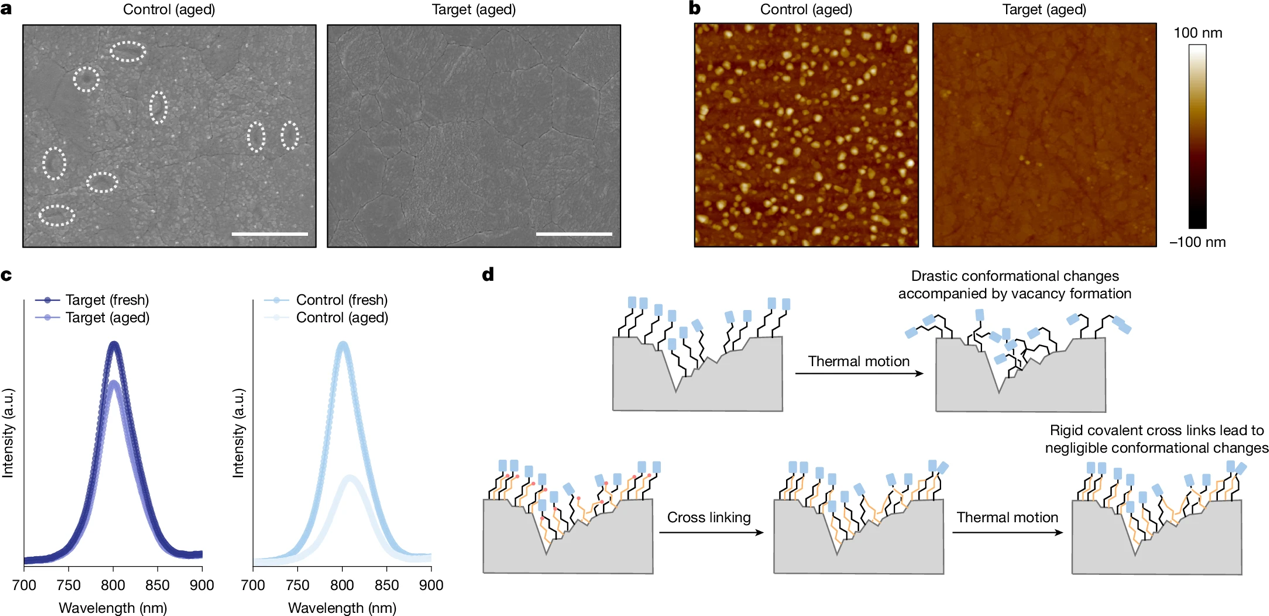 該研究中,研究團隊設計引入了一種優化了碳鏈長度的含疊氮基團新型SAM分子JJ24,能夠增強主體SAM分子CbzNaph在透明導電氧化物襯底表面的分布均一性,并抑制自組裝過程中缺陷和空隙的形成。JJ24分子的含疊氮基團可以通過熱激活方式,與CbzNaph分子的烷基鏈原位共價交聯,構成緊密組裝的co-SAM層(圖1)。這一結構顯著增強了CbzNaph的擇優取向性(圖2),并通過強化CbzNaph分子烷基鏈連接體剛性,抑制在光照和熱應力下因分子擺動而引起的透明導電氧化物襯底表面暴露,防止了鈣鈦礦層埋底界面分解,并抑制器件界面處的非輻射復合損失(圖3)。