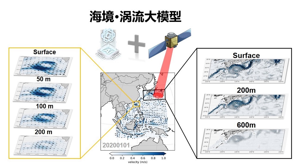 針對這一難點,“海境·渦流大模型”應運而生。它是一款端到端的海洋三維流場智能重構大模型,創新性地利用海表高分辨率衛星遙感數據,通過智能映射技術,實現對海洋三維全流場的快速現報。“海境·渦流大模型”包含兩套流場重構方案:①利用海表衛星數據結合SwinUnet模型直接重構次表層三維全流場;②利用海表衛星和三維溫鹽數據結合創新開發的SpadeUp模型重構次表層三維全流場。方案一能夠有效重構上層350米的海表全流,方案二在有三維溫鹽輸入的情況下能夠進一步提高混合層之下(到550米)全流場的重構精度。