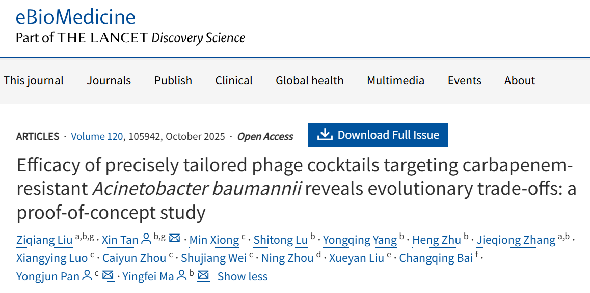 9月18日,中國科學院深圳先進技術研究院定量合成生物學全國重點實驗室、合成生物學研究所合成微生物組學研究中心馬迎飛團隊,聯合南方科技大學醫院重癥醫學科潘勇軍團隊、深圳大學總醫院呼吸科柏長青團隊以及深圳市人民醫院重癥醫學科劉雪燕團隊,在《柳葉刀》旗下轉化醫學領域重要期刊eBioMedicine(醫學1區,IF=10.8)上發表了一項題為“Efficacy of Precisely Tailored Phage Cocktails Targeting Carbapenem-Resistant Acinetobacter baumannii Reveals Evolutionary Trade-offs: a proof-of-concept study”的研究論文。