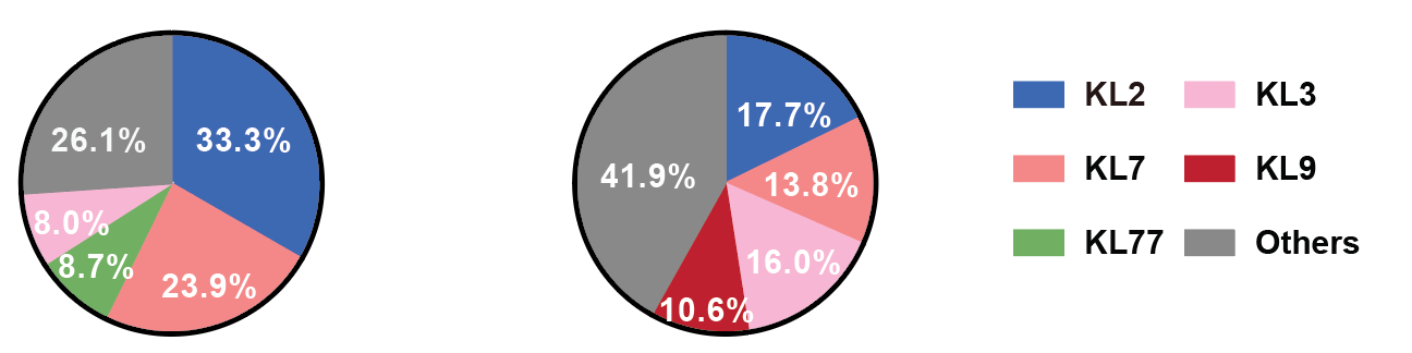 研究團隊從深圳、廣州及中山等地的多家醫院共采集138株臨床分離CRAB,其中莢膜2型(KL2)菌株占比最高,為33.3%。同時,結合兩項全國流行病學研究的896株菌株基因組分析發現,KL2型在全國范圍內的占比仍高達17.7%(圖1)。這提示KL2型CRAB不僅在廣東高發,且已在全國范圍內廣泛流行。
