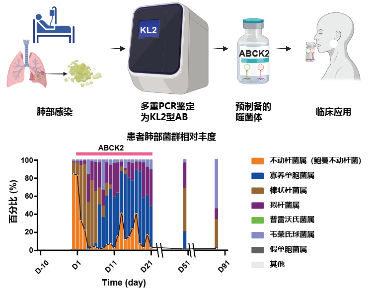 在后續臨床應用中,研究團隊使用ABCK2成功清除了兩例患者肺部感染的KL2型鮑曼不動桿菌,展現出良好的治療效果。該研究不僅驗證了基于流行菌株分型精準設計固定配方噬菌體雞尾酒的可行性與有效性,也為理解噬菌體-宿主共進化關系提供了關鍵證據。成功的臨床案例突顯了ABCK2在治療多重耐藥菌感染中的應用潛力,為推進下一代噬菌體療法的臨床轉化奠定了重要基礎。