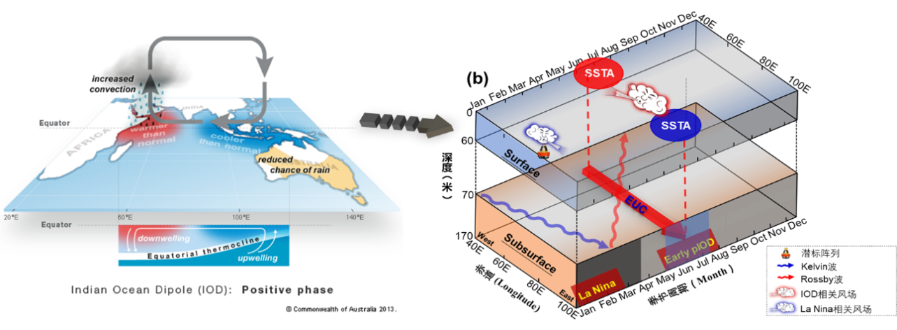 圖1:(a) 赤道潛流是熱帶海洋環流系統中一支“水下高速通道”,影響熱帶物質能量輸運;(b) 赤道印度洋潛流夏季重現背后的“雙重調控魔術”示意圖