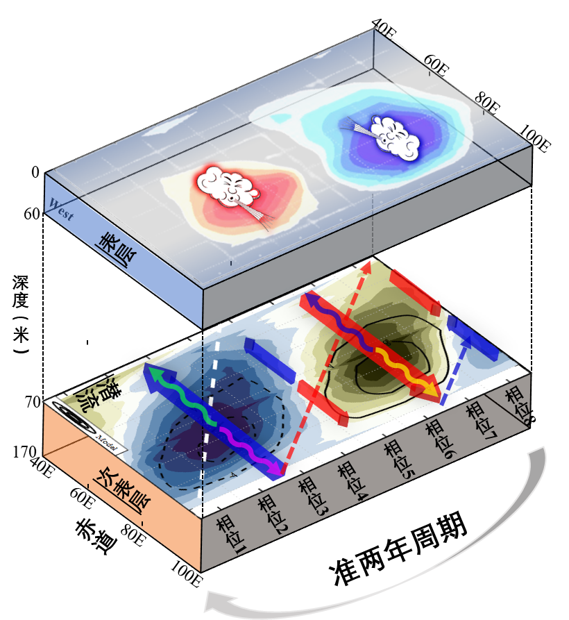 圖2:印度洋偶極子的固有振蕩通過風場–溫躍層的耦合作用,驅動赤道潛流發生復雜的位相演變及準兩年波動響應的機制示意圖