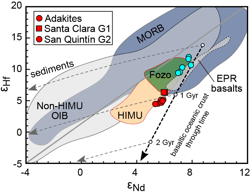?中國科學院廣州地化所地幔地球化學學科組劉海泉副研究員、徐義剛研究員、黃小龍研究員,與李杰研究員、張龍副研究員、張樂高級工程師,墨西哥國立自治大學Thierry Calmus教授和圣路易斯波托西自治大學Alfredo Aguillo?n-Robles博士合作,選擇環太平洋俯沖帶墨西哥下加利福尼亞經典的Santa Clara HNB-埃達克巖組合以及San Quintín高鈮玄武巖為研究對象,運用Mo-Sr-Nd-Hf-Pb同位素示蹤手段,揭示了高鈮玄武巖中的古老再循環洋殼及蛇紋巖組分:
