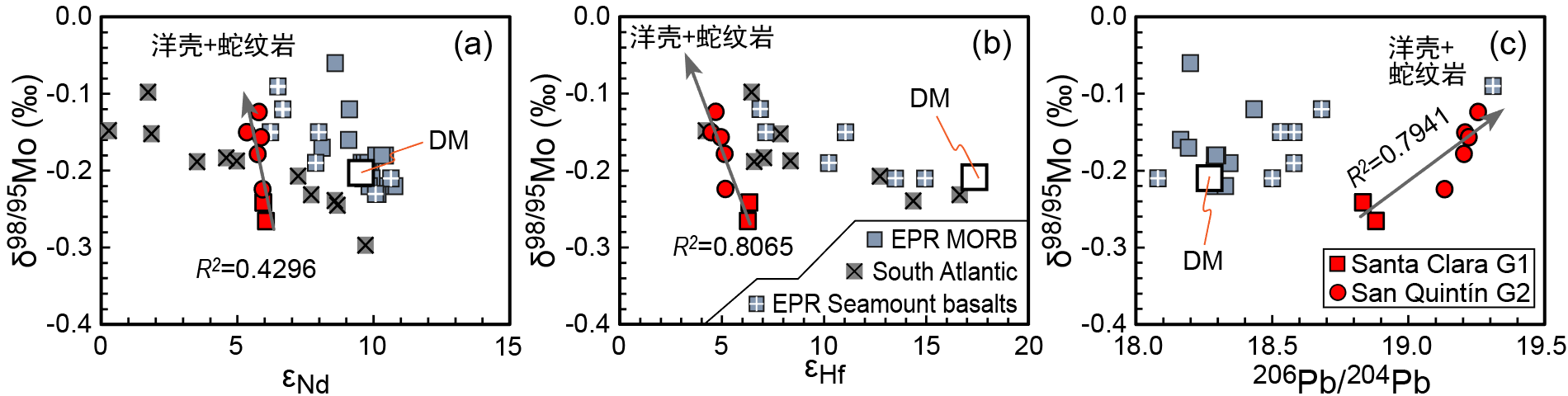 ?3)高鈮玄武巖中Mo同位素的富集與Nd-Hf-Pb同位素變化之間存在協同變化趨勢(圖2),進一步指示再循環蛇紋巖化地幔組分對HNB的成因貢獻(圖3)。由于在俯沖帶氧化環境下,重的Mo傾向于通過熔流體進入地幔楔,殘留洋殼通常具有輕的Mo同位素組成。然而,在板片和地幔楔蛇紋巖還原流體的緩沖下,Mo傾向于不分餾,因而蝕變洋殼的重Mo同位素組成得以保存;同時,板片蛇紋巖流體在上升過程中通過與殘留洋殼反應,可能使殘留洋殼發生Mo同位素再富集。因此,HNB中重Mo同位素組成可能反映了蛇紋巖流體與再循環洋殼的相互作用(圖3)。