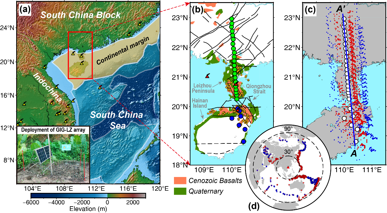 ?針對這些問題,中國科學院廣州地球化學研究所的博士后張周與其合作導師鄧陽凡研究員、徐義剛研究員及李鑫副研究員,聯合中國科學院南海海洋研究所張錦昌研究員,利用課題組新近布設的GIG-LZ寬頻帶地震臺陣,結合中國地震局在海南島上的部分固定臺站(圖1),通過基于P波和S波接收函數的多種分析方法,揭示了雷瓊火山區具有薄的、高Vp/Vs比值和高熔體分數的地殼屬性,全區巖石圈厚度自內陸向海南島具有逐漸減薄的特征。文章主要結論如下:
