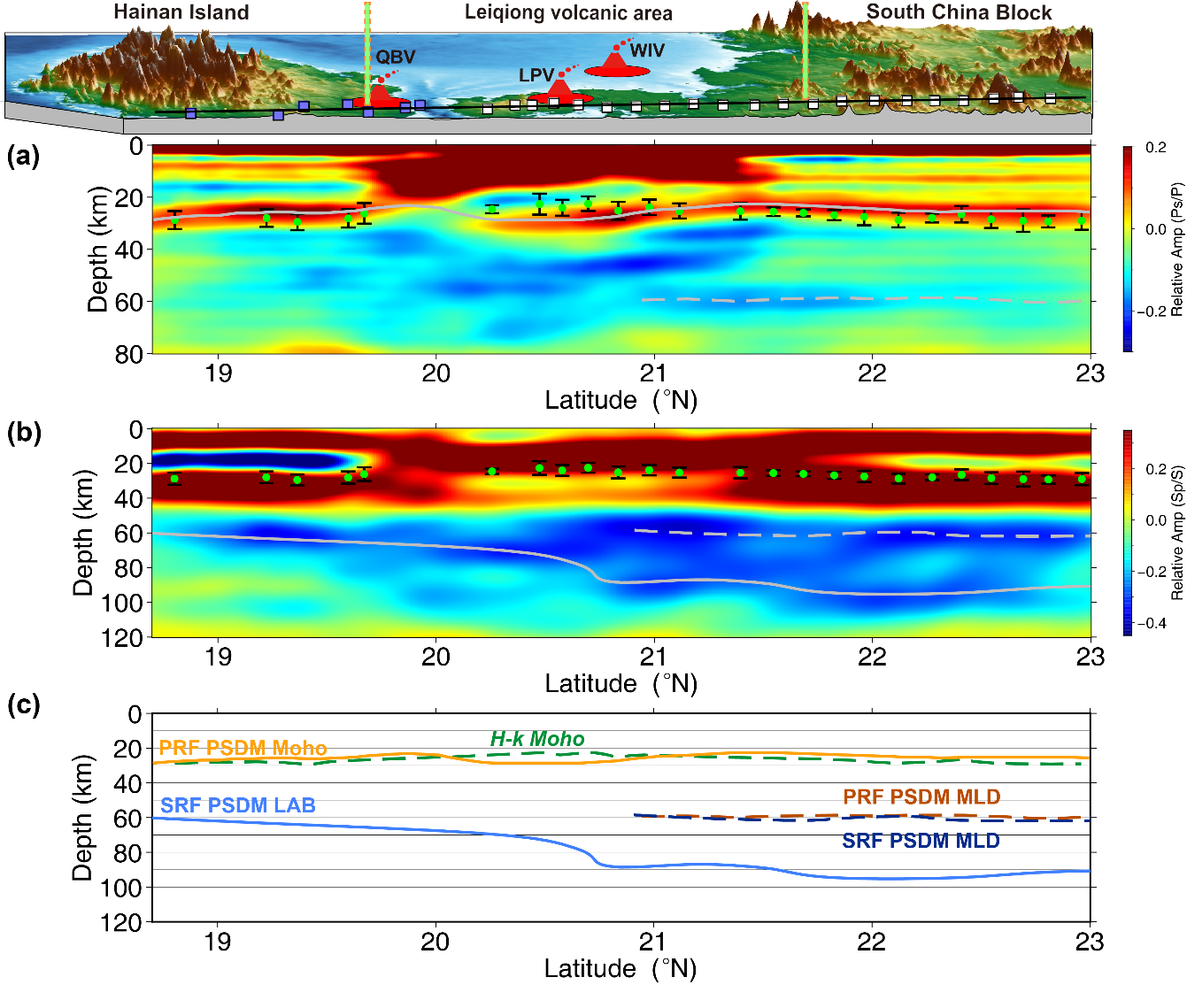 圖2. (a,b)沿A-A'剖面的P波接收函數(PRFs)和S波接收函數(SRFs)的疊后深度偏移成像(PSDM)圖像。綠點表示P波接收函數波形疊加方法估算的地殼厚度。(c)A-A'剖面莫霍面、MLD和LAB界面的示意圖。頂部俯視圖顯示地震臺站分布:白色立方體為GIG-LZ陣列臺站,藍色立方體為固定臺站。QBV: 瓊北火山;LPV: 雷州半島火山;WIV: 潿洲島火山。