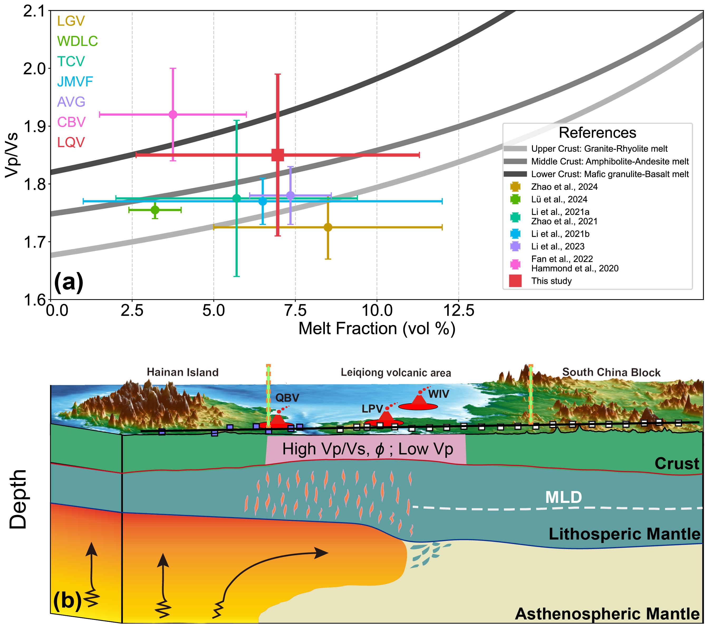圖3. (a)國內典型火山區地殼熔體分數的對比圖。(b)雷瓊火山區巖石圈改造與巖漿系統特征的概念模型圖。綠橙條帶標示剖面沿線的華南陸塊、雷瓊火山區與海南島分界。