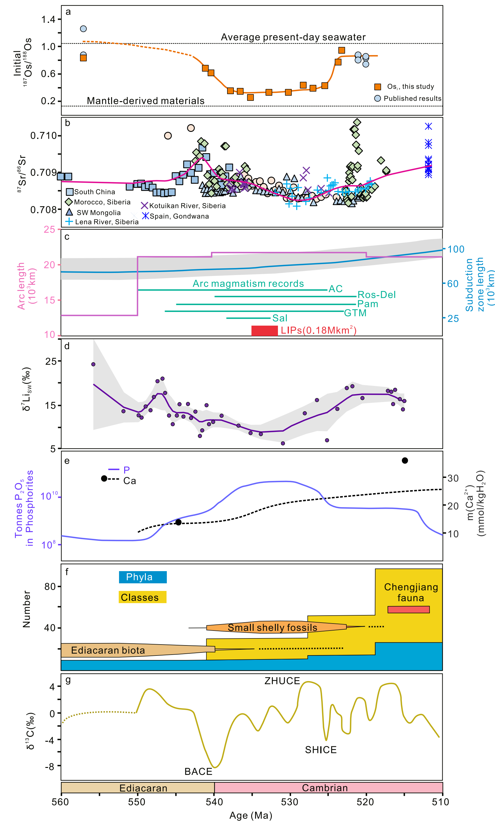 圖1?約560–510 Ma期間的構造運動、磷塊巖分布、同位素地球化學記錄(δ13Ccarb-Os-Sr-Li)與生物多樣性模式關系圖。a:本研究及前人報道的Os同位素記錄(Xu et al., 2011; Fu et al., 2016);b:匯總的Sr同位素記錄(Derry et al., 1994; Brasier et al., 1996; Kaufman et al., 1996; Kaufman et al., 2007);c:大陸弧長度、俯沖帶長度(Mills et al, 2017)、LIPs (Ernst et al., 2021) 以及弧巖漿活動記錄(Zhu et al., 2012; Brown et al., 2020; Oriolo et al., 2021);d:鉆孔ZK4803碳酸鹽巖樣品的Li同位素記錄。紫色線顯示使用局部加權散點平滑法得到的最佳估計曲線,其95%置信區間以灰色區域表示;e:?全球尺度磷塊巖礦床估算的P2O5噸位(Cook and Shergold,1984) 以及海水Ca2+濃度演化(Horita e al., 2002;?Brennan et al., 2004);f?:全球范圍內的門和綱級生物數量(Erwin et al., 2011);g:碳酸鹽δ13Ccarb記錄(Zhu et al., 2006)。