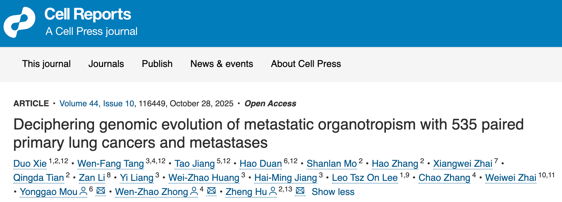 近日,中國(guó)科學(xué)院深圳先進(jìn)技術(shù)研究院合成生物學(xué)研究所胡政、廣東省人民醫(yī)院/廣東省肺癌研究所鐘文昭和中山大學(xué)腫瘤防治中心牟永告團(tuán)隊(duì)在Cell Reports在線發(fā)表題為“Deciphering genomic evolution of metastatic organotropism with 535 paired primary lung cancers and metastases”的研究論文。報(bào)道了對(duì)223例非小細(xì)胞肺癌基因組測(cè)序數(shù)據(jù)(共885個(gè)原發(fā)/轉(zhuǎn)移配對(duì)腫瘤樣品)的分析結(jié)果,揭示了不同轉(zhuǎn)移部位的克隆起源、轉(zhuǎn)移趨向性決定基因以及轉(zhuǎn)移灶中觀察到由雜合性丟失驅(qū)動(dòng)的“早期驅(qū)動(dòng)突變丟失”現(xiàn)象。