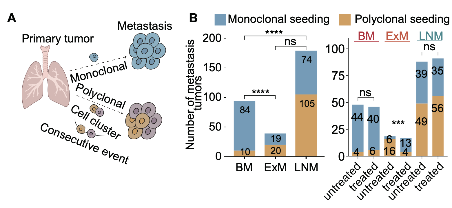 然后,研究者通過(guò)團(tuán)隊(duì)之前開(kāi)發(fā)的轉(zhuǎn)移克隆性計(jì)算框架,比較原發(fā)/轉(zhuǎn)移灶中攜帶突變的腫瘤細(xì)胞比例(cancer cell fraction或CCF),解析了轉(zhuǎn)移的克隆起源模式,即單克隆起源(monoclonal seeding)或多克隆起源(polyclonal seeding)(圖3A)。單克隆起源指轉(zhuǎn)移由原發(fā)灶中的單個(gè)細(xì)胞發(fā)起(“單兵作戰(zhàn)”),而多克隆起源指轉(zhuǎn)移由多個(gè)細(xì)胞發(fā)起(“團(tuán)隊(duì)協(xié)作”)。研究者發(fā)現(xiàn)多克隆起源在腦轉(zhuǎn)移中相比于其他轉(zhuǎn)移中相對(duì)較為普遍(圖3B左),且藥物治療并不影響這一結(jié)果(圖3B右)。該結(jié)果表明腦部的獨(dú)特結(jié)構(gòu)(例如血腦屏障)導(dǎo)致原發(fā)灶腫瘤細(xì)胞在轉(zhuǎn)移過(guò)程中面臨高強(qiáng)度的選擇壓力,造成了顯著的瓶頸效應(yīng)。