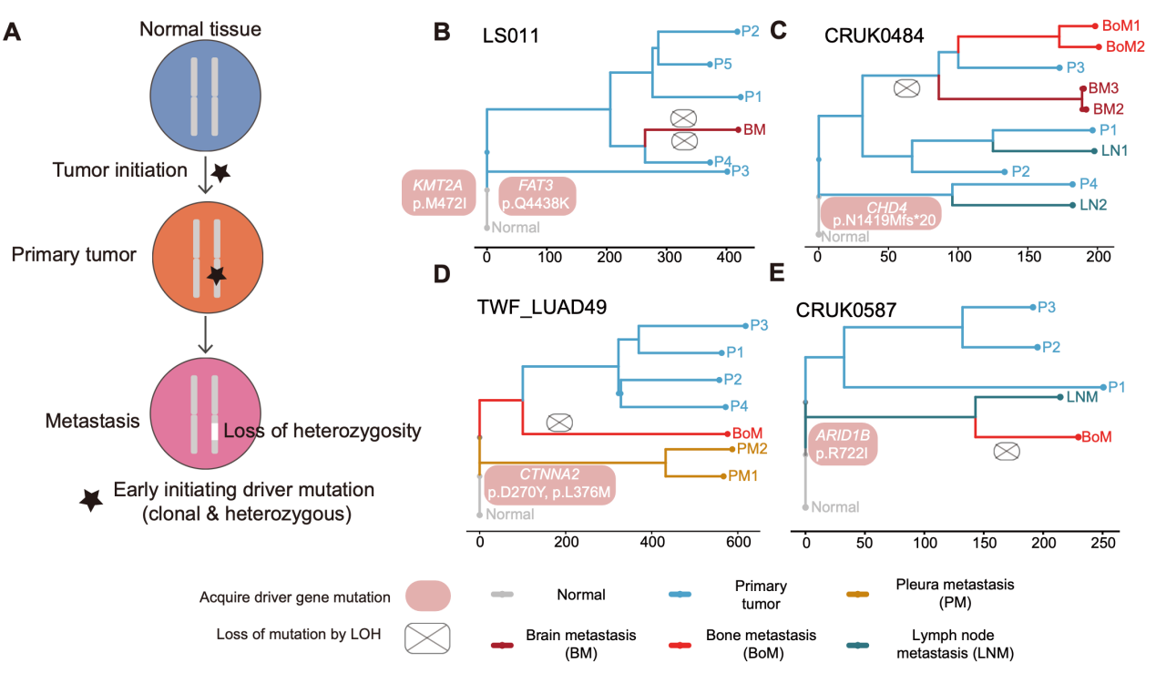 最后,在多例配對(duì)進(jìn)化樹(shù)中,研究者鑒定到轉(zhuǎn)移灶通過(guò)特異性LOH而丟失原發(fā)階段即存在的早期驅(qū)動(dòng)突變,提示轉(zhuǎn)移微環(huán)境可能對(duì)部分“原發(fā)適應(yīng)性驅(qū)動(dòng)”施加負(fù)選擇,導(dǎo)致早期在原發(fā)部位獲得的驅(qū)動(dòng)突變?cè)谵D(zhuǎn)移灶丟失(圖4)。