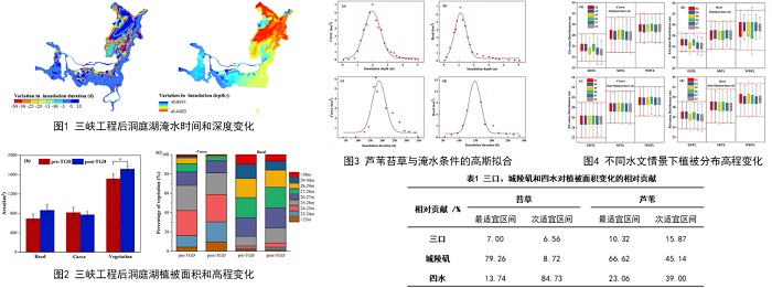 針對這一科學問題,中國科學院亞熱帶農業生態研究所謝永宏研究員團隊基于長期水文觀測數據、遙感影像解譯和MIKE 21水動力模型模擬,對比分析了三峽大壩運行前后洞庭湖淹水格局與植被格局的時空演變特征,并通過設置多種水文情景,首次量化了湖泊入水口與出水口水文條件對植被變化的貢獻。結果表明:(1)三峽大壩運行后,三口年均徑流和城陵磯年均水位均顯著下降,且兩者的年內變化特征在大壩運行前后存在差異,其中7-12月較大壩運行前減少,而1-3月增加;(2)洞庭湖平均淹水時間減少9天,平均淹水深度降低0.25米,其中東洞庭湖變化最為顯著;(3)植被面積擴大并向湖心移動,其中蘆葦面積增加且分布高程明顯下移,擠占苔草空間;(4)苔草和蘆葦適宜的淹水時間分別為132–240天和110–186天,表明蘆葦在水位減少條件下競爭優勢更強;(5)城陵磯出水口水位下降是洞庭湖植被演替的主要驅動因素,對比三口四水,城陵磯水文條件對苔草和蘆葦最適宜生長面積的貢獻分別為79.26 %和66.62 %。