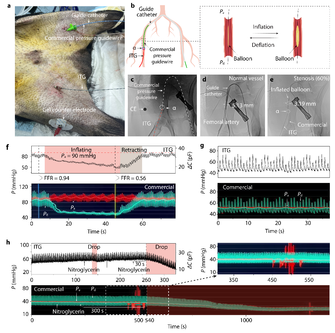 除高操控性外,ITG兼具優(yōu)異的壓力傳感性能。在模擬液體環(huán)境中,ITG對壓力變化呈現(xiàn)線性電容響應(yīng),靈敏度達(dá)0.39 pF mmHg-1。在 10,000 次循環(huán)加載后信號無顯著漂移。在豬血管內(nèi),ITG 可持續(xù)穩(wěn)定記錄真實(shí)脈動波形,并對細(xì)微波動做出快速響應(yīng)(圖3)