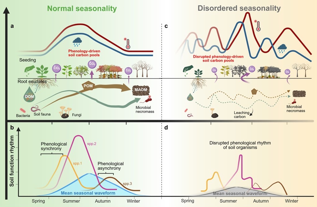 圖. 氣候驅動的季節性物候紊亂可能削弱土壤碳的持久性:(a)在正常季節條件下,地上與地下生物之間協調的物候節律調節著碳輸入、微生物轉化過程以及持久性礦物結合有機質的形成。土壤動物(如蚯蚓)示意性地代表了參與土壤碳轉化的關鍵功能類群。DOM,溶解性有機質;POM,顆粒有機質;(b)土壤生物(例如,物種1-3)在不同季節表現出獨特的物候活動模式,對土壤功能節律的貢獻各不相同。平均季節波形反映了由多個類群產生的綜合信號;(c)在季節秩序紊亂的情況下,氣候變化破壞了這種同步性。植物、微生物和動物物候活動在時間和強度上的變化,可能導致碳輸入與微生物需求脫節,分解連續過程碎片化,并改變營養級相互作用,最終降低土壤碳持久性和生態系統恢復力;(d)此類紊亂通過改變土壤生物的物候模式,可能使土壤功能節律趨于平緩并破壞其同步性。