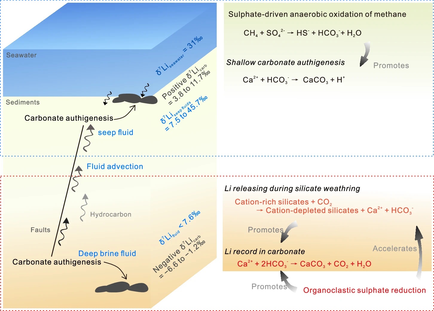 研究團(tuán)隊(duì)對(duì)墨西哥灣不同沉積環(huán)境的自生碳酸鹽開(kāi)展了鋰同位素(δ7Li)分析。結(jié)果顯示,深部OSR相關(guān)碳酸鹽的δ7Li值(?6.6‰至?1.2‰)顯著低于淺層甲烷厭氧氧化成因碳酸鹽(δ7Li: +3.8‰至+11.7‰)(圖1)。這一獨(dú)特的負(fù)值特征是目前全球已知碳酸鹽礦物中最低值,同位素分餾計(jì)算得出的孔隙流體 δ7Li 值(?4.0‰至1.4‰)與巖石中硅酸鹽相的 δ7Li值(?5.1‰至?1.2‰)高度接近,表明該環(huán)境下硅酸鹽風(fēng)化接近 “全等風(fēng)化”—— 即原生硅酸鹽礦物溶解速率遠(yuǎn)高于次生硅酸鹽形成速率,釋放的鈣和堿度為碳酸鹽沉淀提供了關(guān)鍵物質(zhì)基礎(chǔ)。這一研究證實(shí)了碳酸鹽巖鋰同位素作為追蹤碳-硅相互作用的有效指標(biāo),也揭示了鹵水、有機(jī)質(zhì)礦化與硅酸鹽風(fēng)化三者在深部沉積環(huán)境中協(xié)同調(diào)控海洋碳匯的復(fù)雜過(guò)程(圖2)。