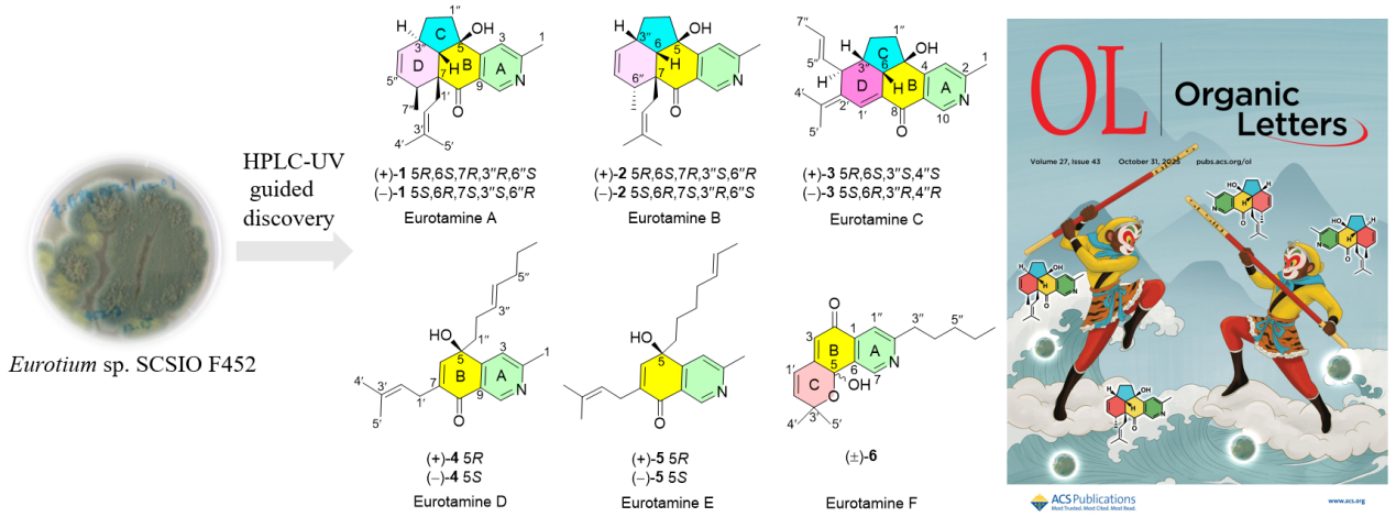 近日,中國科學院南海海洋研究所熱帶海洋環境與島礁生態全國重點實驗室、熱帶海洋生物資源與生態實驗室張偲院士團隊在南海沉積環境來源真菌中活性新骨架異喹啉型生物堿對映異構體的發現領域取得新進展,相關成果以“HPLC–UV-Guided Discovery of Eurotamines A–F: Six Pairs of Isoquinoline Derivative Enantiomers from Marine-Derived Fungus Eurotium sp. SCSIO F452”為題,表于國際有機化學領域自然指數期刊Organic Letters,并入選Supplementary Cover。項目研究員仲偉茂為論文第一作者,研究員王發左、院士張偲為共同通訊作者。