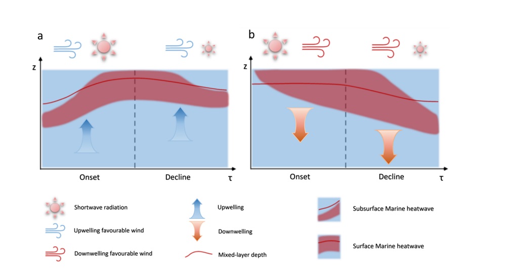 海洋熱浪可理解為“水中的熱浪”,當海水溫度在一段時間內顯著高于氣候平均值時便形成此類事件。長期以來,學界普遍認為沿岸上升流系統(Coastal Upwelling System)可能是抵御熱浪的“冷庇護所”(thermal refugia)。上升流由季風或沿岸風驅動,將深層冷水輸送到表層,從而抵消部分變暖效應。然而,上升流與海洋熱浪究竟如何相互作用?它能否真正“限制”海洋熱浪的發展深度?這些問題一直缺乏系統的定量研究。
