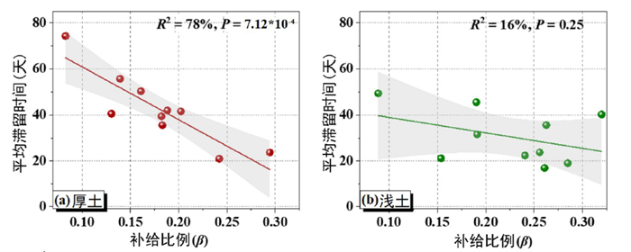 中國科學院亞熱帶農業生態研究所陳洪松研究員團隊在廣西環江通過水穩定同位素示蹤技術,揭示了坡地土壤厚度對入滲和徑流水補給特征的影響機制。該研究選取兩處土壤厚度差異顯著的山坡,通過長期原位監測獲取土壤水和徑流樣本,并測定其氫氧穩定同位素組成。基于分段同位素平衡模型,量化了降雨對可移動水的補給比例、平均滯留時間及干旱期徑流的蒸發損失比例。結果表明,滲透性更高的淺土山坡具有快速的水分補給特征,表現為更高的雨水補給和水分蒸發損失比例及更短的水分滯留時間(圖1)。厚土山坡補給比例和滯留時間具有極顯著的相關性(R2=0.78),而淺土山坡這種快速且復雜的水文特征導致其通過水文參數預測過程的難度更高(圖2)。因此,即便是在小流域范圍,在水資源優化配置方面也需要考慮進行差異性的管理,而土壤厚度理論上是一個重要的參考指標。