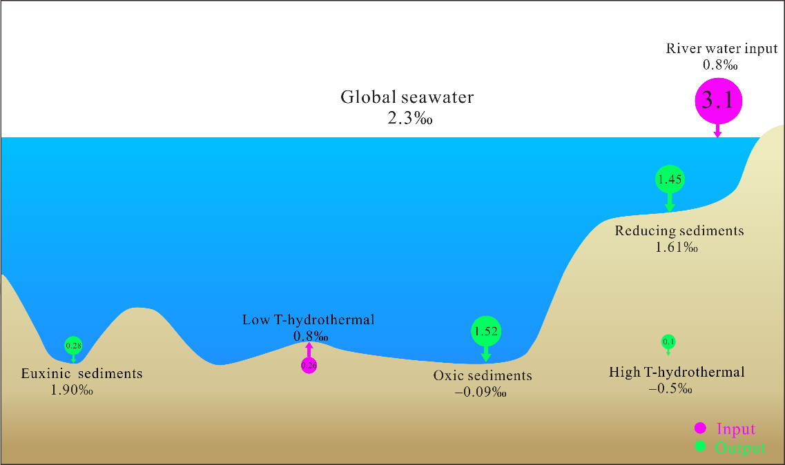 圖 4. 海洋鉬(Mo)同位素質(zhì)量平衡的最新模型。該示意圖展示了全球Mo收支平衡中的主要輸入項(紫色圓圈:河流輸入、低溫?zé)嵋狠斎耄┡c輸出項(綠色圓圈:各類沉積物、高溫?zé)嵋狠敵觯C總€圓圈的大小與估算通量成正比,通量數(shù)值標(biāo)注于圓圈內(nèi)(單位:×10? mol / 年,黑色字體)。本模型的概念框架基于 Little 等人(2025 年)的研究成果。