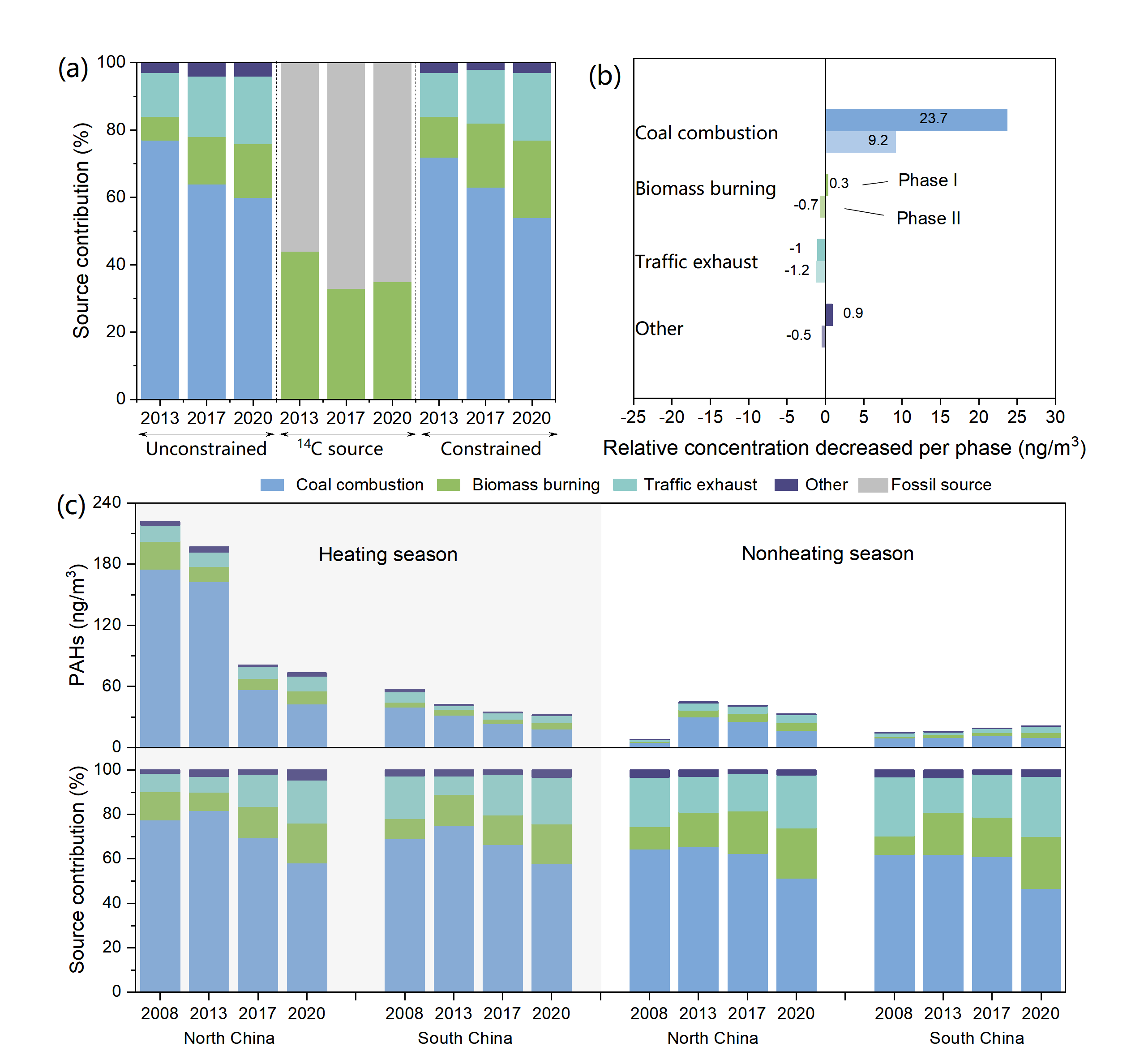 圖2. (a)2013、2017和2020年P(guān)MF模型初始結(jié)果與引入14C-BC約束結(jié)果中PAHs四種來源之間的貢獻(xiàn)比較。(b)兩次清潔空氣政策階段,燃煤、生物質(zhì)燃燒、交通排放及其他來源PAHs濃度的下降趨勢(shì)。(c)2008、2013、2017和2020年中國南方和北方的采暖季(HS)和非采暖季(Non-HS)不同來源PAHs濃度的季節(jié)性和區(qū)域性變化。