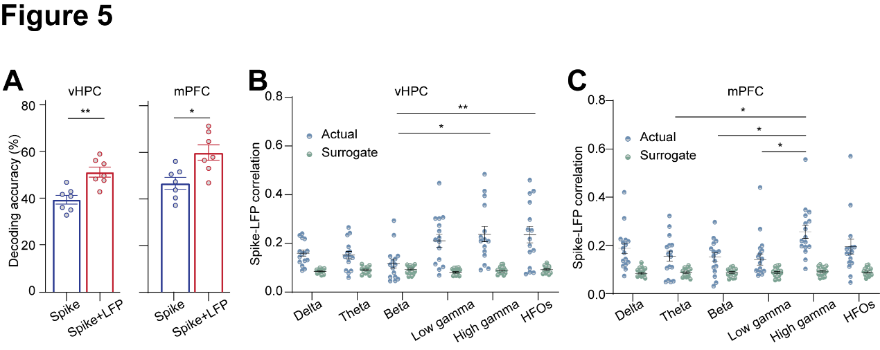 研究中,團隊記錄了自由活動小鼠在三箱社交互動范式中vHPC與mPFC中的神經(jīng)元放電活動(spike)和局部場電位(local field potential, LFP)。單神經(jīng)元放電頻率分析與群體解碼結(jié)果顯示,盡管在vHPC與mPFC中均存在對不同社交刺激表現(xiàn)出增強或抑制反應(yīng)的神經(jīng)元響應(yīng)群體,但兩個腦區(qū)的神經(jīng)元響應(yīng)比例是有差異的,且mPFC神經(jīng)元表現(xiàn)出更廣泛的選擇性。研究還進一步分析了興奮性和抑制性神經(jīng)元對不同社交刺激的反應(yīng)模式。
