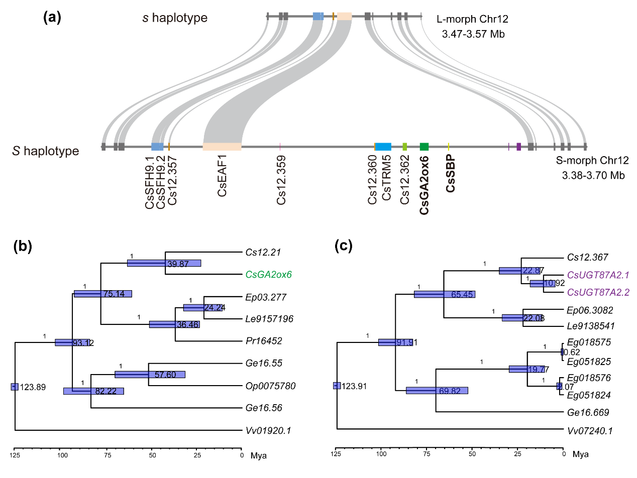 研究人員構建了橙花破布木長柱型和短柱型的染色體級基因組,結合重測序、轉錄組以及轉基因功能驗證,系統解析了該物種控制二型花柱發育的超基因結構、功能及起源演化。研究發現:(1)控制不同花型的超基因包含約180kb的半合子區域(含8個候選基因),該區域僅存在于短柱花個體中,在長柱花個體中完全缺失;(2)系統發育分析表明該超基因在演化過程中通過“逐步復制與組裝”的方式形成;(3)超基因中CsSBP?(Squamosa promoter-binding protein)基因在短柱花花絲-花冠筒部位特異性表達,調控花絲伸長的關鍵基因;(4)CsGA2ox6僅在短柱花花柱中特異性高表達,可降解活性赤霉素,是調控花柱長度的關鍵功能基因。轉基因驗證表明,在煙草中過表達CsGA2ox6可導致煙草花柱顯著縮短,并且表現出類似自交不親和的花粉管阻滯現象,提示該基因可能同時參與調控花柱長度與自交不親和性。該研究不僅再次證實了異型花柱演化過程中存在遺傳趨同機制(即S-locus均呈半合子結構),而且首次實驗論證了赤霉素代謝基因在花柱長度調控中的關鍵作用,這一機制區別于以往研究所強調的油菜素內酯或生長素信號通路。此外,研究還提示花柱長度基因可能兼具調控自交不親和性的功能,該發現為深入理解異型花柱類群中異型自交不親和與花型多態性的調控機制提供了重要科學依據。