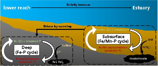河口區(qū)域沉積物P釋放(內源P負荷)是調控水體營養(yǎng)狀況的重要過程。P的內源性釋放主要由Fe和Mn的氧化還原行為驅動:缺氧條件下微生物利用有機質作為電子供體,還原Fe/Mn氧化物,并釋放其吸附的P。溫度是該過程的關鍵影響因素,因為其直接控制微生物礦化有機質的速率。然而,在水動力和沉積環(huán)境復雜的河口區(qū)域,季節(jié)性溫度如何調控Fe/Mn與P的耦合循環(huán),尤其是在新沉積的、氧化還原界面不穩(wěn)定的表層沉積物中,其作用機制尚不明確。