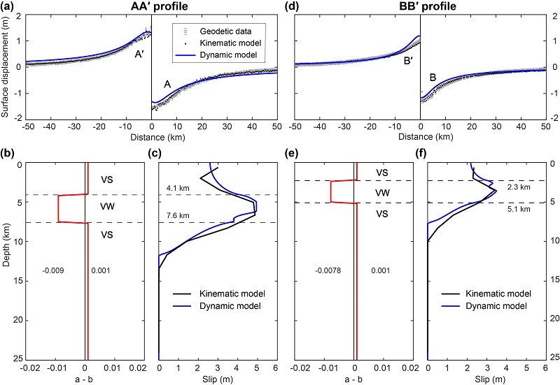 圖3?動力學模型的摩擦屬性設置及模型在地表和深度上的滑移預測與運動學模型對比