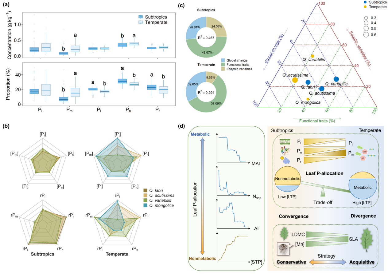 圖. 亞熱帶和溫帶森林中落葉櫟葉片磷分配策略的差異和調控機制