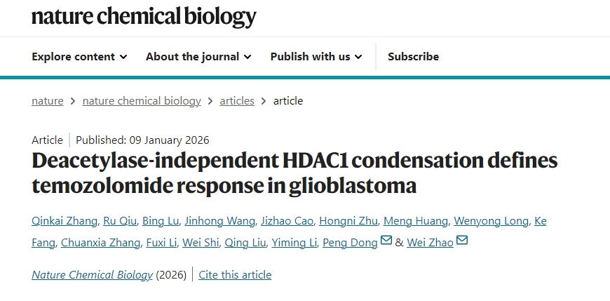 1月9日,中山大學中山醫學院趙蔚教授與中國科學院深圳先進技術研究院/醫學成像科學與技術系統全國重點實驗室研究員董鵬團隊合作在Nature Chemical Biology發表了題為“Deacetylase-Independent HDAC1 Condensation Defines Temozolomide Response in Glioblastoma”的研究論文。該研究發現,替莫唑胺(TMZ)治療可誘導膠質母細胞瘤(GBM)細胞形成HDAC1-CTCF凝聚體,從而導致染色質結構重塑和DNA修復活性增強,促進TMZ獲得性耐藥的發生。更為重要的是,研究團隊鑒定出小分子化合物Resminostat能夠特異性靶向該凝聚體,在耐藥GBM的患者來源異種移植(PDX)模型中顯著恢復TMZ敏感性,有效克服腫瘤耐藥。