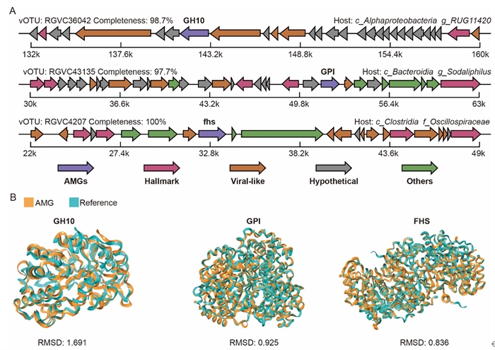 ?圖4?對關鍵病毒輔助代謝基因的基因組背景和蛋白結構比對驗證