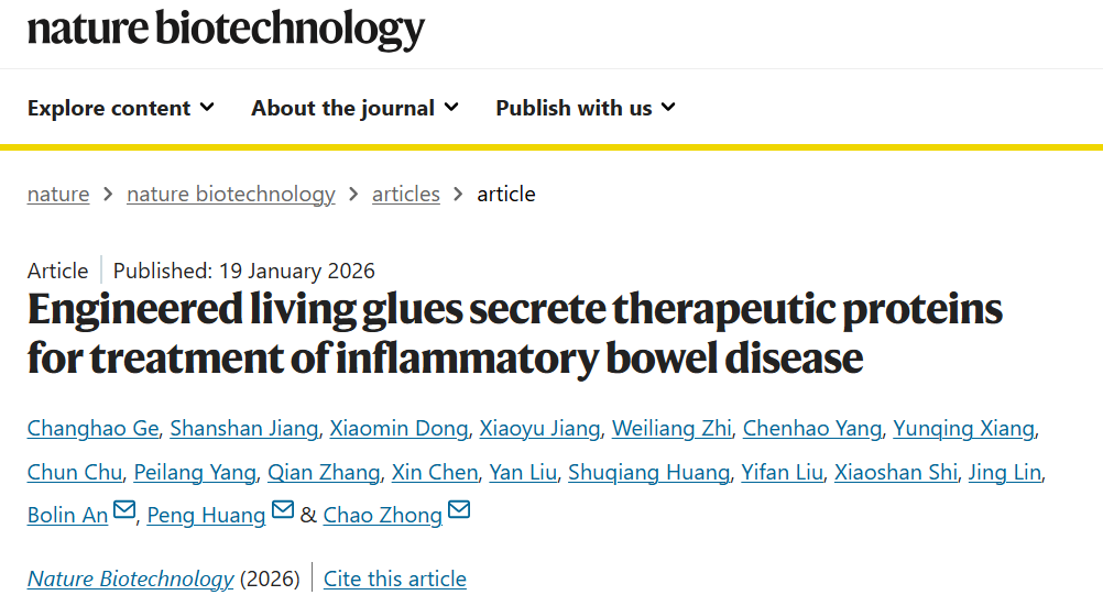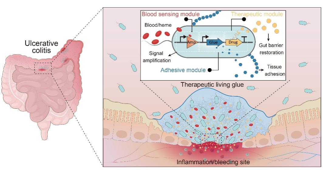 1月19日,中國科學(xué)院深圳先進(jìn)技術(shù)研究院定量合成生物學(xué)全國重點(diǎn)實(shí)驗(yàn)室、合成生物學(xué)研究所鐘超團(tuán)隊(duì)聯(lián)合深圳大學(xué)醫(yī)學(xué)部黃鵬教授團(tuán)隊(duì)在《自然-生物技術(shù)》發(fā)表研究,提出一種面向IBD的“智能活膠水”(Therapeutic Living Glue, TL-glue)。該體系以工程化腸道細(xì)菌為載體,能夠感知腸道出血信號(hào),在病灶處原位形成兼具黏附與治療功能的生物膠基質(zhì),實(shí)現(xiàn)“感知—定位—治療”一體化干預(yù),為IBD精準(zhǔn)治療提供了新的合成生物工程思路。