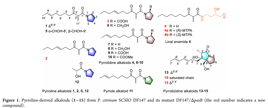團(tuán)隊以幾丁質(zhì)酶抑制活性為導(dǎo)向,對一株沙蟲來源的海洋真菌Penicillium citrinum SCSIO DF147進(jìn)行深入挖掘,從中發(fā)現(xiàn)了5類包括吡咯、吡咯啉、吡咯烷、吡咯里西啶、及開環(huán)吡咯烷共15個吡咯啉衍生生物堿(1-15),含5個新化合物 (圖1)。為該類化合物的研究奠定了基礎(chǔ)。