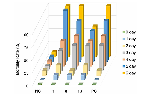 圖3?用5.0 mM化合物1、8和13喂養(yǎng)的P. xylostella的死亡率。