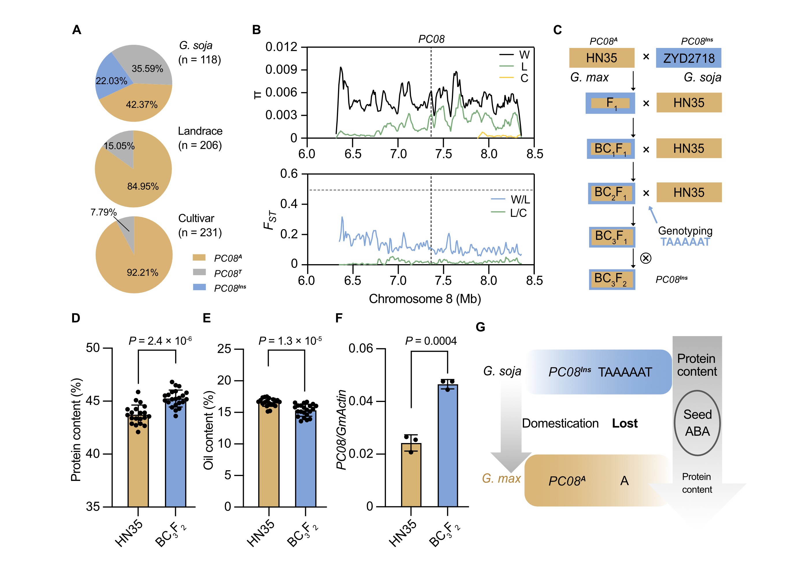 野生植物成功馴化為農作物,是人類文明史上的重大突破。這一過程曾極其漫長,而現代育種技術能顯著加速作物改良和野生植物的快速再馴化(Doebley et al., 2006)。大豆(Glycine max?L. Merr.)由野生大豆(Glycine soja?Siebold & Zucc)馴化而來,野生大豆蛋白含量(50–60%)豐富,但在長期馴化過程中,選擇目標主要聚焦于株型直立、莢果不易開裂、籽粒大小及含油量等性狀,導致栽培大豆蛋白含量(30–40%)較低。因此,挖掘并解析野生大豆所攜帶的高蛋白關鍵遺傳因子,對現代栽培大豆的蛋白產能提升具有重要意義。近日,中國科學院華南植物園侯興亮團隊在PNAS發表題為A natural allele of?PC08?lost in domestication contributes to soybean seed storage protein accumulation的研究論文,研究團隊鑒定了一個在野生大豆馴化過程中遺失的高蛋白等位基因。研究團隊利用全基因組關聯分析(GWAS),鑒定到一個調控蛋白含量關鍵基因PC08(Protein Contributor 08),PC08是脫落酸(ABA)生物合成的限速酶NCED5同源基因。進一步分析發現,其啟動子上的短序列插入導致基因表達水平升高,進而通過調節ABA含量促進種子貯藏蛋白積累。群體馴化分析進一步揭示,高蛋白含量單倍型PC08Ins僅存在于野生大豆中,是栽培大豆馴化過程中遺失的關鍵等位基因。回交改良結果表明,將高蛋白位點PC08Ins導入栽培大豆黑農35后,其種子蛋白含量得到顯著提高,展現出巨大的育種應用前景。侯興亮研究團隊長期致力于大豆種子發育及品質形成研究,并取得了一些重要進展(Yu et al., Nature Plants, 2023; Li et al., Molecular Plant, 2024; Zhang et al., Nature Communications, 2025)。該研究進一步鑒定到大豆種子蛋白含量形成位點的關鍵基因。中國科學院華南植物園博士后劉書為該論文第一作者,侯興亮研究員與李曉明副研究員為共同通訊作者,廣州大學孔凡江教授、華南植物園張春雨副研究員、碩士生曾珮淳和已畢業碩士生班定悅參與了該研究。相關研究得到國家重點研發計劃、國家自然科學基金和廣東省自然科學基金等項目的資助。圖. 大豆馴化中遺失的PC08等位基因提高種子蛋白含量