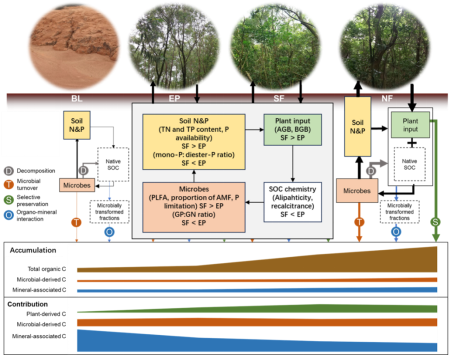 近日,中國科學院華南植物園恢復生態學團隊在熱帶造林碳匯研究方面取得重要進展。研究發現,在熱帶退化海岸臺地進行多樹種混交造林比單一樹種人工林能更有效地促進土壤有機碳的積累,而土壤中磷元素的活化與可利用性提升是這一過程的關鍵驅動因素。圖1. 不同造林方式下土壤有機碳(SOC,a)、微生物殘體碳(MRC,b)、鋁/鐵結合態有機碳(Al/Fe-SOC,c)、木質素與酚類相對豐度(d)、MRC占SOC比例(e)及Al/Fe-SOC占SOC比例(f)。樣地類型包括:裸地(BL)、桉樹人工林(EP)、次生混交林(SF)和天然林(NF)。研究團隊基于小良熱帶海岸生態系統定位研究站長達60年的植被恢復序列,選取——裸地、桉樹純林、混交次生林和天然林四種典型植被類型,系統比較了其土壤有機碳、養分含量、微生物特性及碳組分構成。結果顯示,經過60年的恢復,混交林的土壤有機碳含量比裸地提高了68.2%,而桉樹純林僅提高36.5%,顯示出多物種森林在碳積累方面的顯著優勢。進一步分析發現,混交林中土壤磷的有效性顯著高于純林,表現為更高的有效磷含量和更低的磷單酯/二酯比值,表明其磷循環更為活躍。同時,混交林中的土壤微生物群落結構也發生了明顯變化,叢枝菌根真菌比例上升,微生物對磷的需求增強,進而通過分泌酸性磷酸酶等機制促進土壤中磷的活化。圖2. 桉樹人工林(EP)與混交次生林(SF)土壤剖面中磷庫結構:脂肪族指數(a)、難分解性指數(b)、正磷酸鹽磷在總磷中的占比(c)及單酯磷與雙酯磷比值(d)。研究還指出,混交林中植物與微生物之間的相互作用更為密切,植物通過根系分泌物和菌根網絡促進磷的遷移與利用,而微生物則通過提高周轉和促進微生物殘體碳的積累,共同推動土壤有機碳的形成與穩定。圖3. 混交林通過增強磷有效性與調控微生物群落促進土壤碳積累的機制。該研究系統闡明了熱帶海岸臺地造林過程中“樹種多樣性—土壤磷有效性—微生物過程—土壤碳積累”之間的聯動機制,強調了在熱帶退化地區造林時應優先選擇多樹種混合配置,并重視土壤磷素的動態監測與管理。研究人員建議,未來熱帶森林恢復項目應注重樹種搭配,尤其是引入具有固氮能力的樹種,以增強土壤養分循環,激活微生物群落,從而實現更高效、更持續的土壤碳匯增匯與生態系統恢復目標。這項研究不僅深化了對熱帶森林碳—磷耦合機制的理解,也為全球氣候變化背景下的森林管理與生態修復提供了實踐路徑。相關研究成果以“Accelerated soil carbon accumulation in an afforested multispecies forest compared with a monoculture driven by larger soil phosphorus mobilization”為題發表在國際學術期刊Journal of Environmental Management(《環境管理雜志》)上,中國科學院華南植物園鶴山站助理研究員李悅為論文第一作者,劉占鋒研究員為通訊作者。研究獲得了廣東省基礎與應用基礎研究旗艦項目和國家自然科學基金等資助。論文地址:https://doi.org/10.1016/j.jenvman.2025.127955
