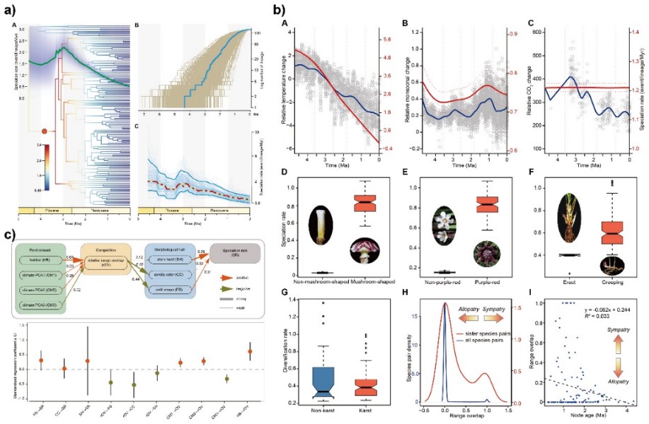 解析全球生物多樣性在不同時空尺度上的形成機制是當前進化生物學中的重大科學問題之一,其核心是要揭示物種快速分化的驅動力。當前,主要有兩種觀點分別從生物與非生物因素方面來闡述物種快速分化的驅動機制。“宮廷小丑”模型(Court Jester model)認為非生物因素(如氣候波動、造山運動等)對大尺度的物種分化起主導作用,而“紅皇后”模型(Red Queen model)則認為生物因素(如性狀創新、生物間相互作用等)是促進物種快速分化的主要驅動力。但毫無疑問,在生命的長河中,生物的宏演化是受到了多種生物和非生物因素的共同作用。然而,以往的研究絕大多數往往僅聚焦在某一個或一類因素方面,尤其忽視了多種因素之間的協同作用,即多種非生物與生物因素通過時空耦合共同塑造多樣化格局。蜘蛛抱蛋屬(Aspidistra;又稱為一葉蘭)是單子葉植物天門冬科(Asparagaceae)的一個大屬。當前,該屬中已發表了超過200個物種,主要分布在亞洲的熱帶、亞熱地區,尤其是中越邊境的喀斯特石灰巖地區是其物種多樣性的中心。這個屬除了具有豐富的物種多樣性之外,其物種的地理分布式樣和花形態多樣性也呈現出顯著的特點,如廣泛的鄰域及同域分布,豐富的柱頭擬態性狀。蜘蛛抱蛋屬的這種地理分布模式一方面預示著生態物種形成的普遍存在,另一方面也暗示著物種間的競爭對其分化具有重要作用。另外,蜘蛛抱蛋屬極其豐富的花性狀多樣性也間接地反映了傳粉者選擇對該屬物種分化的作用;尤其是,其與蕈蚊的傳粉—哺育互利共生關系可以快速地促進雙方的快速分化。由此可見,蜘蛛抱蛋屬的物種分化可能受到多方面的生物與非生物因素的影響,但當前人們對該屬進化歷史的認識還知之甚少。科研團隊通過對123種蜘蛛抱蛋屬物種進行了簡化基因組測序,并重建該屬迄今取樣最多、分辨率最高的系統發育樹。基于該穩健的系統發育框架,研究團隊估算了該屬的分化時間,并基于多種方法分析了該屬物種形成速率演化動態。結果顯示蜘蛛抱蛋屬為一個年輕的類群,其起源于中新世和上新世的邊界期(5.49 Ma;95% HPD: 3.8–7.57 Ma),在上新世暖期(Mid Piacenzian Warm Period;2.6–3.6 Ma)其物種分化速率顯著加快,達到2.27個物種/百萬年(圖2a)。這一物種形成速率超過舊世界植物區系中所有已報道的物種形成速率。這也預示著蜘蛛抱蛋屬代表著舊世界植物區系中物種分化速率最快的類群之一。研究團隊進一步利用多種統計模型解析了蜘蛛抱蛋屬物種快速分化的驅動力,發現包括古溫度、東亞季風變化、物種競爭及傳粉共生等多種生物與非生物因素可以同時獨立又協同地促進蜘蛛抱蛋屬的物種形成及快速輻射(圖1-b,c)。?圖1.?多種生物與非生物因素協同作用于蜘蛛抱蛋屬的物種分化 ?圖2.?JIPB第67卷11期的封面中國科學院華南植物園康明研究員團隊和廣西壯族自治區中國科學院廣西植物研究所林春蕊研究員等合作研究成果以題為“The interplay of abiotic and biotic factors likely drove one of the fastest plant radiations from tropical-subtropical Asia”近期發表在國際學術期刊Journal of Integrative Plant Biology (JIPB)(《植物學報》)?上。該研究為理解植物物種快速分化提供了新的見解,并被選為期刊當期封面故事(圖2)。中國科學院華南植物園楊麗華博士為論文的第一作者,康明研究員和廣西植物研究所林春蕊研究員為論文共同通信作者。法國國家科學研究中心蒙彼利埃進化科學研究所Fabien L. Condamine研究員和廣西壯族自治區中國科學院廣西植物研究所劉演研究員參與了論文的指導工作。該研究得到了廣東省基礎與應用基礎旗艦項目、中國科學院戰略生物資源計劃項目和國家自然科學基金項目的資助。文章鏈接:https://onlinelibrary.wiley.com/doi/10.1111/jipb.70031