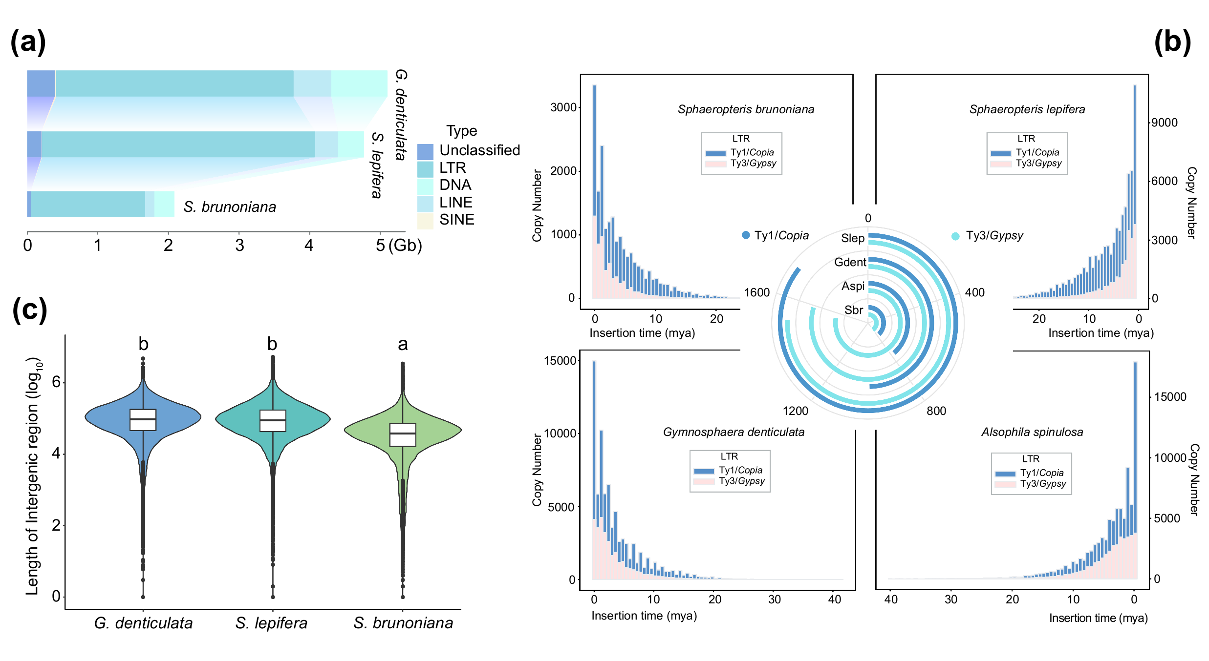 桫欏科樹蕨是蕨類植物中典型的古老孑遺類群,因起源古老和獨特的樹形而備受關注。其宏觀形態自侏羅紀以來高度保守,被譽為恐龍時代“活化石”。盡管形態演化緩慢,該類群卻表現出豐富的物種多樣性及較強的環境適應能力,成功應對億萬年數次環境劇變,引發了進化生物學中長期未解的謎題:為何這些類群能在保持穩定外形的同時,具備如此強大的生存韌性?中國科學院華南植物園植物進化與保護研究團隊構建了不同生態型?(典型喬木狀樹形及無顯著樹干的非樹形)桫欏科植物高質量基因組圖譜,整合比較基因組學與轉錄組學,?深度解析了其基因組演化機制。結果發現,在整體分子進化速率相對緩慢的背景下,整個樹蕨譜系僅在約1.54億年前共享一次全基因組復制(WGD)事件。該事件賦予了樹蕨雙重適應優勢,不僅賦予了祖先樹蕨對侏羅紀晚期環境劇變的適應能力,也為后期物種多樣化提供了遺傳基礎。典型樹形物種優先保留與細胞壁合成和木質化相關的基因以強化支撐結構,而非樹形物種則更多保留代謝與防御相關基因以增強生存韌性。研究還發現,轉座子元件的持續爆發驅動了基因組結構動態變化,包括顯著的基因組大小變異和染色體重排,成為局部快速演化的核心驅動力。此外,喬木狀的表型創新并非簡單依賴于WGD滯留基因劑量,而更依賴于復雜的轉錄調控,該機制可能通過協同木質素合成與光感知過程,進一步促進樹蕨在被子植物主導的林下環境中的適應。該研究將傳統認知的活化石植物“演化停滯”重新定義為一種基因組的動態平衡。宏觀進化遲緩背景下的基因組可塑性與局部創新,正是樹蕨成功跨越億萬年地質變遷的演化密鑰。該成果不僅為桫欏科珍稀“活化石”蕨類植物的保護研究提供了重要的基因組資源,同時為理解古老孑遺植物的長期存續與演化提供了全新理論框架。相關研究成果以?“Resolving the stasis-dynamism paradox: Genome evolution in tree ferns”?為題發表在進化生物學權威期刊Molecular Biology and Evolution(《分子生物與進化》)。中國科學院華南植物園在讀博士研究生魏作影為論文第一作者,根特大學Yves Van de Peer教授、中國科學院華南植物園康明研究員及王靜研究員為通訊作者。中國科學院華南植物園馮超副研究員等國內外科研人員參與了該研究。該研究工作得到了廣東省重點領域研發計劃、國家自然科學基金、廣東基礎與應用基礎研究旗艦項目等的資助。文章鏈接:https://doi.org/10.1093/molbev/msaf247圖1.?桫欏科植物的WGD事件及后續基因保留圖2.?桫欏科植物基因組多樣性