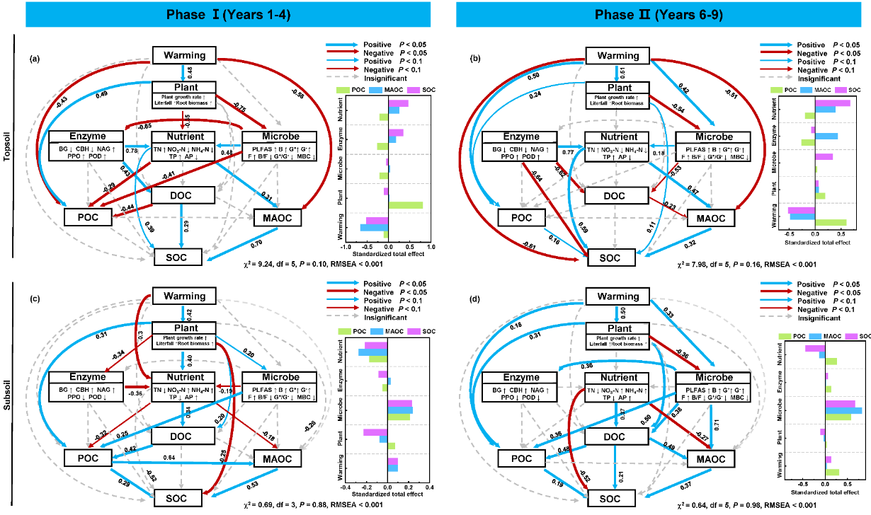 熱帶和亞熱帶森林被認為是全球最具固碳潛力的生態系統之一,其土壤碳儲量約占全球陸地土壤有機碳的三分之一以上。然而,該地區未來可能面臨更加頻繁的高溫事件,未來增溫下這些生態系統能否持續積累土壤有機碳仍存在較大不確定性。一直以來,由于缺乏長期生態系統水平的增溫實驗,使得增溫引起的植物-土壤相互作用變化如何驅動土壤有機碳的溫度響應尚不明確,嚴重阻礙了對未來碳-氣候反饋的準確預測和基于森林的氣候緩解方案的科學制定。針對這一問題,中國科學院華南植物園鼎湖山站劉菊秀研究員團隊于2012年在鼎湖山站建立了野外生態系統水平被動增溫實驗平臺(+0°C、+1.0°C、+2.1°C),開展了長期觀測研究。研究發現,土壤不同有機碳組分對增溫的響應受增溫時間的影響。土壤有機碳對增溫的響應呈“兩個階段”(圖1、2和3):在第一階段(1–4年),增溫導致土壤有機碳凈損失,主要由于增溫刺激的植物-微生物養分競爭導致土壤表層礦物結合態有機碳顯著減少;在第二階段(6–9年),由于持續的植物碳輸入和微生物碳代謝的熱調整使得植物來源的顆粒有機碳顯著增加,從而導致土壤有機碳的凈積累。這些結果表明,在適度增溫下,一些濕潤的熱帶和亞熱帶森林土壤可能繼續積累有機碳,挑戰了以往僅基于土壤增溫實驗而得出的結論:即普遍預測未來變暖會使熱帶和亞熱帶森林成為碳源。該研究加深了人們對增溫下植物-土壤相互作用如何驅動亞熱帶森林土壤有機碳長期動態變化的理解。該研究是對先前基于該實驗平臺觀察到南亞熱帶森林生態系統碳儲量在增溫6年后增加現象(https://doi.org/10.1111/gcb.17072)的進一步深入的機制探究。相關研究成果以”Long-term moderate warming shifts soil carbon cycling but maintains carbon sinks in a subtropical forest”為題,發表在Cell旗下環境科學與生態學領域國際期刊One Earth(IF5-years=19.2)上。中國科學院華南植物園鼎湖山站博士后劉旭軍為論文的第一作者,劉菊秀研究員和美國密歇根大學Peter B. Reich院士為共同通訊作者。研究得到了國家自然科學基金、廣東省重點項目、廣東省科技計劃和中國博士后科學基金的支持。論文鏈接:https://doi.org/10.1016/j.oneear.2025.101465圖1. 增溫對南亞熱帶森林土壤有機碳及其組分的影響圖2. 生物與非生物因子對土壤有機碳及其組分的影響圖3. 增溫下植物-土壤相互作用對南亞熱帶森林土壤有機碳組分的調控機制
